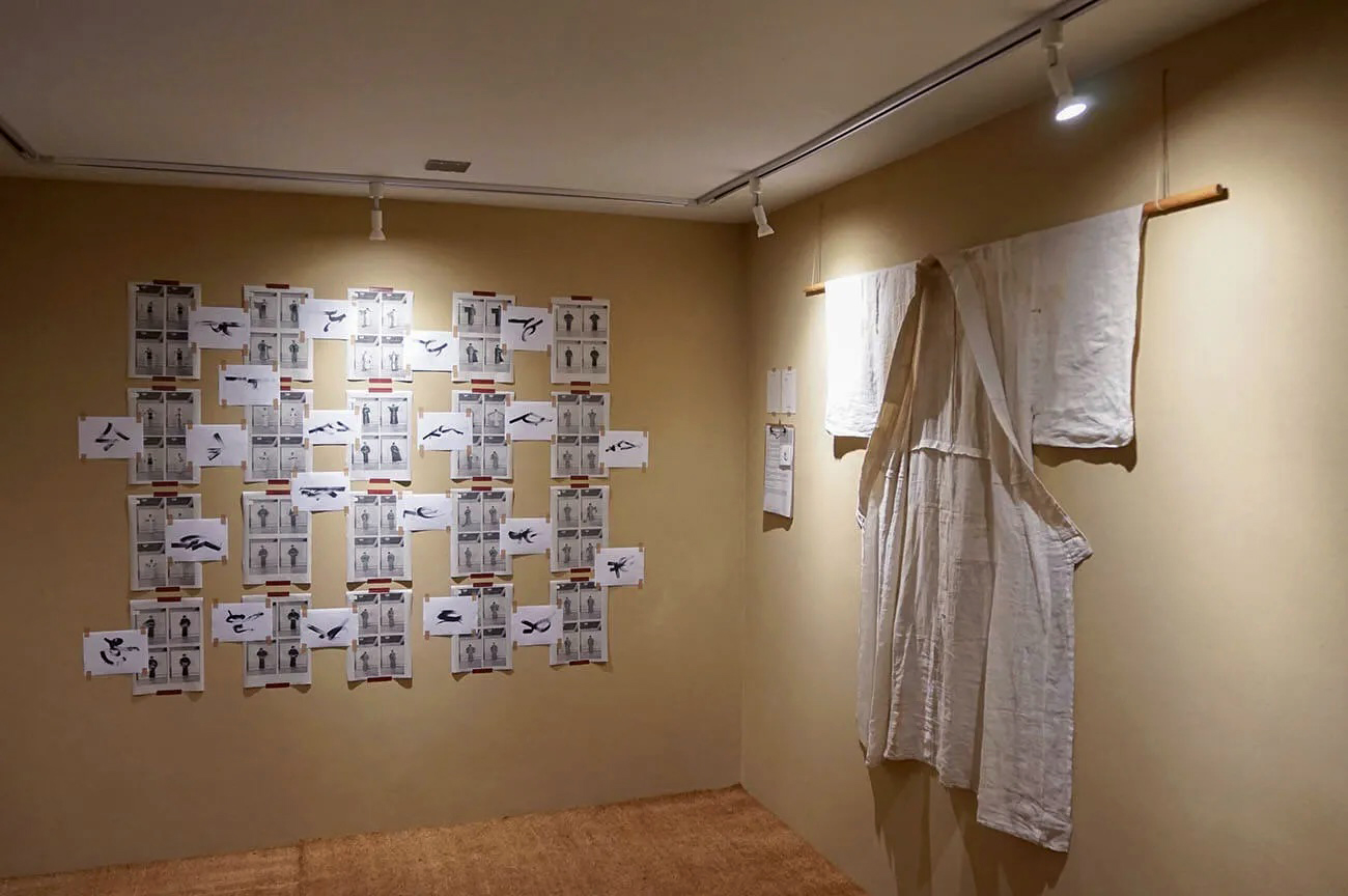 再想像 (Re-imagining): Designed Interpretation of the Kimono and Nagajuban, Using Materials Sourced Locally to Fujiyoshida, 2022. Displayed at Saruya AIR, Fujiyoshida, Japan.